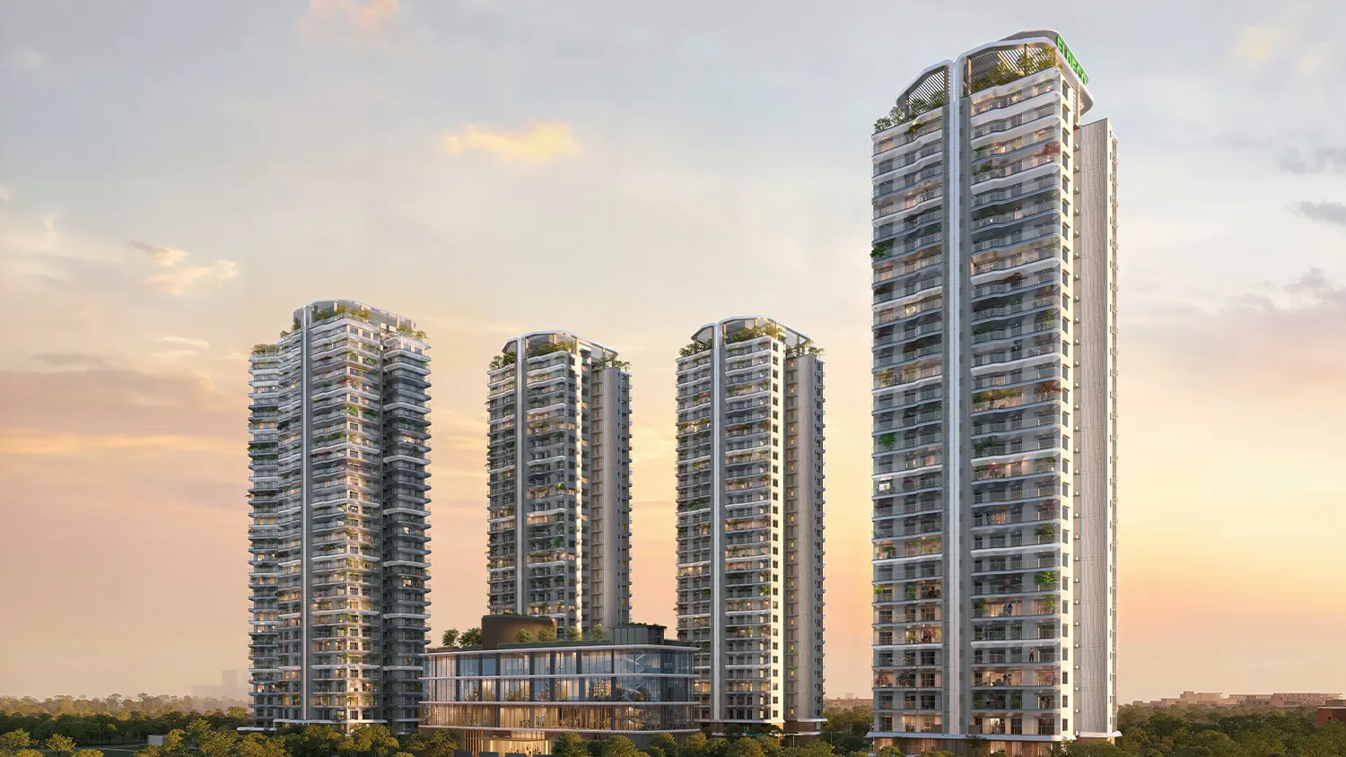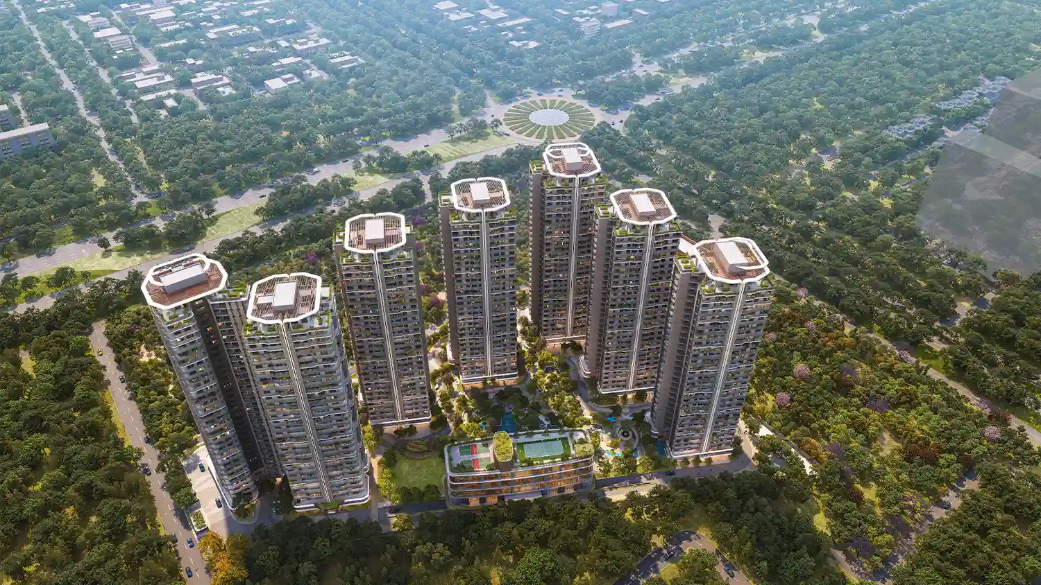 Spread across approximately 8 acres of prime land in Omicron 1A, the project features 7 well-planned towers with around 850 premium residences. The low-density layout ensures ample open spaces, landscaped greens, and enhanced privacy for residents. Built on a rare four-side open plot, every apartment enjoys abundant natural light, excellent cross-ventilation, and scenic surroundings. With only four apartments per floor and each home being a corner unit, residents experience superior privacy and better airflow.