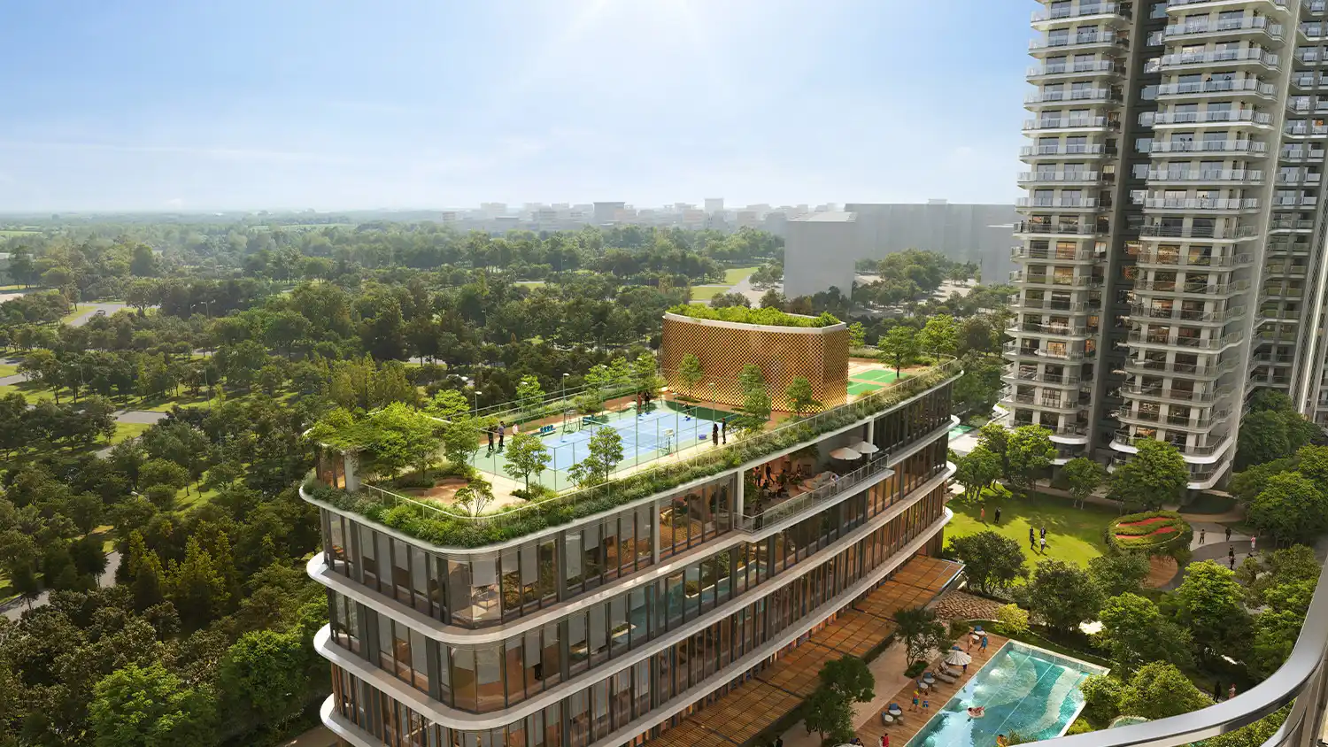 Spread across approximately 8 acres of prime land in Omicron 1A, the project features 7 well-planned towers with around 850 premium residences. The low-density layout ensures ample open spaces, landscaped greens, and enhanced privacy for residents. Built on a rare four-side open plot, every apartment enjoys abundant natural light, excellent cross-ventilation, and scenic surroundings. With only four apartments per floor and each home being a corner unit, residents experience superior privacy and better airflow.